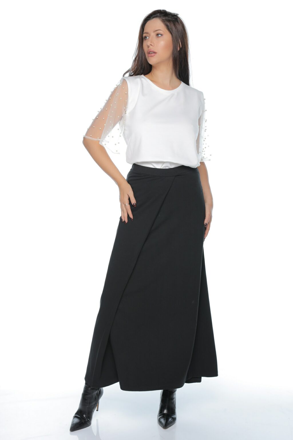 Fusta de zi origami lunga, neagră, petrecută are un croi modern, stil eleganț minimalist